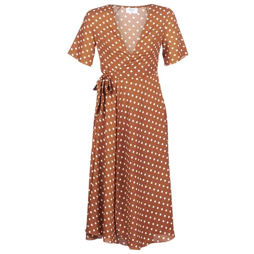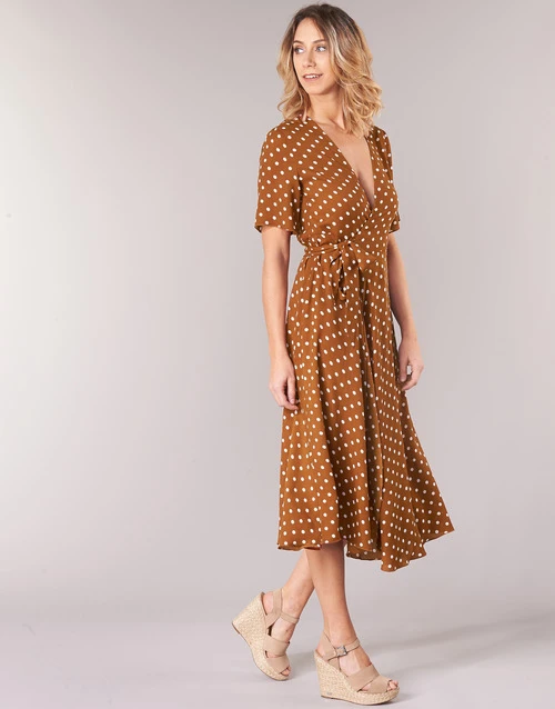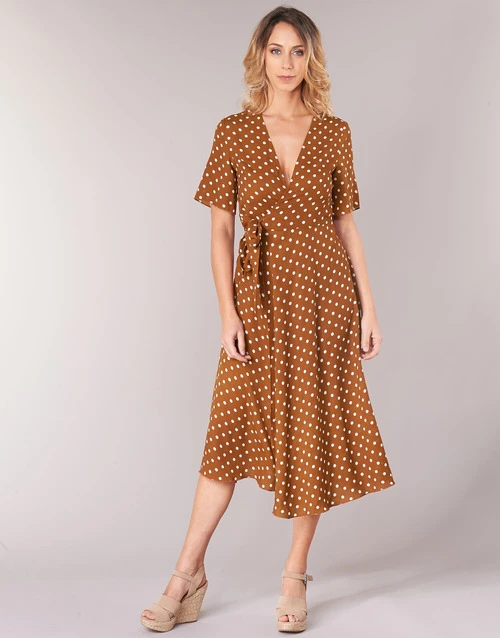In vintage style , deze lange wikkeljurk met witte stippen op een bruine achtergrond. Een musthave model voor de dressing van dit seizoen. Bedankt Betty London!